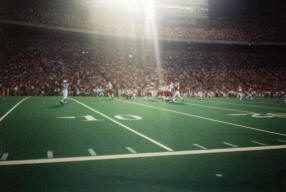 Perhaps both teams were feeling a bit disabled. However, Fresno State wide receiver Bernard Berrian picked up where he left off last year and hauled in a pass to break the wrapper on the scoring. Wisconsin fans grew shaky with flashbacks of last year’s breakdown and subsequent loss. More debilitating to the Bulldog offense was the game ending injury that Berrian suffered shortly following his first score. Now both teams were dealing with sub par health in the passing category and it was frustrating watching the Badgers have to rely so heavily on the running game in this contest, but it did prove effective as Matt Bernstein scored on two short runs, the second giving Wisconsin a 17-14 advantage in the third quarter.