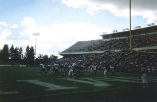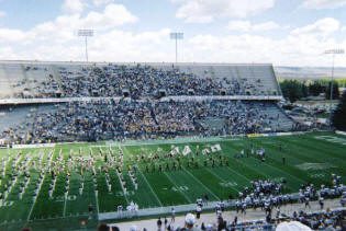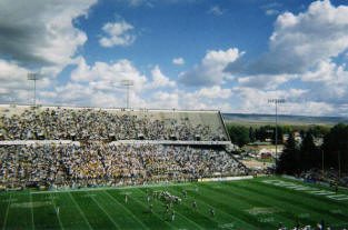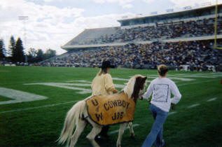 We started the game in our seats in the upper deck absorbing the views of wide-open spaces in the distance, the classic pine trees surrounding the stadium, and the infinite blue sky that looked down. By halftime, we ventured down to the fences where the team exits the field. Many fans had the same idea as a rather large group gathered to watch the action at field level. Security is not a high priority at War Memorial (my guess is that streakers don’t frequent the turf too often in Laramie), so the crowd posed limited problems. We continued to view the game from our new found location for the second half. Jason Bouknight’s only touchdown pass of the day occurred almost directly in front of us. The band played “Cowboy Joe” as a few Cowgirls toted a Shetland pony around the stadium celebrating the score.