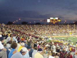 We sat most of the game on the Toledo side and let me tell ya…Rocket fans mean business. Yes, this may be a MAC team, but they display much passion and knowledge for this sport and they bring it with them on the road. Their band and fans made a resounding presence in the corner of Kelly Shorts. We sat right near the Toledo players and found that Central fans harbored the same passion. Hecklers could be heard offering unpleasant words for the Rockets. Maybe it isn’t Alabama/Auburn or Ohio State/Michigan, but it is proof that fans even in the smaller conferences recognize their own rivalries and express their opinions as fervently as possible. On a beautiful night in Mount Pleasant, the Chippewas notched a win in their home opener, the first for new head coach, Butch Jones. We left quickly after the game, but we knew the party rolled on in Mount Pleasant. The sound of crickets is all that might be heard from their neighbors to the south in Ypsilanti.