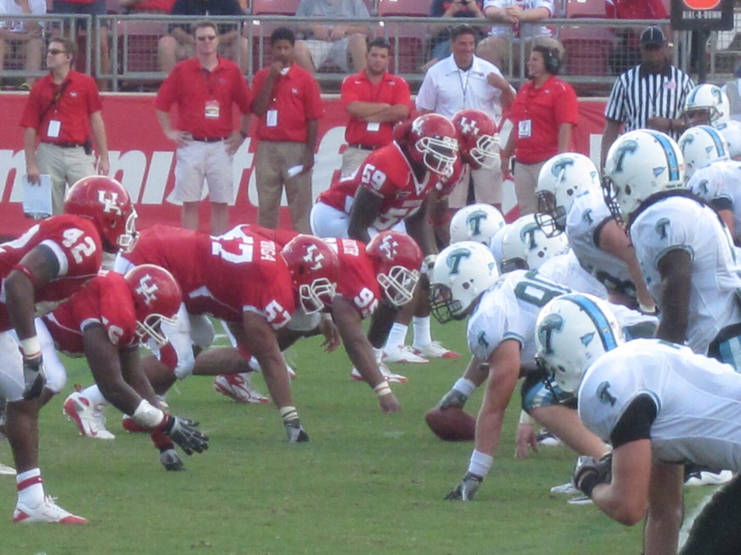 The stands did not reflect the near sell-out crowd recorded in the box score after the Cougars’ victory over the Green Wave. Perhaps it was the lack of QB Case Keenum that kept fans away. Houston’s electrifying quarterback was set to break the all-time passing yard record this season when UCLA took out his ACL last week. The lower fan numbers could also be due to the loss of Houston’s backup QB due to a broken collarbone. Although both these factors can drain the energy out of a fan base, so can mid 90 degree temperatures and a sun that just could not find a cloud to hide behind. Usually, Cougar games take place at night, but this time, the television schedule would not allow for a sun strokeless event. Rather, Houston fans were forced to fry as they watched the third string quarterback, Terrance Broadway, take charge of the offense.
