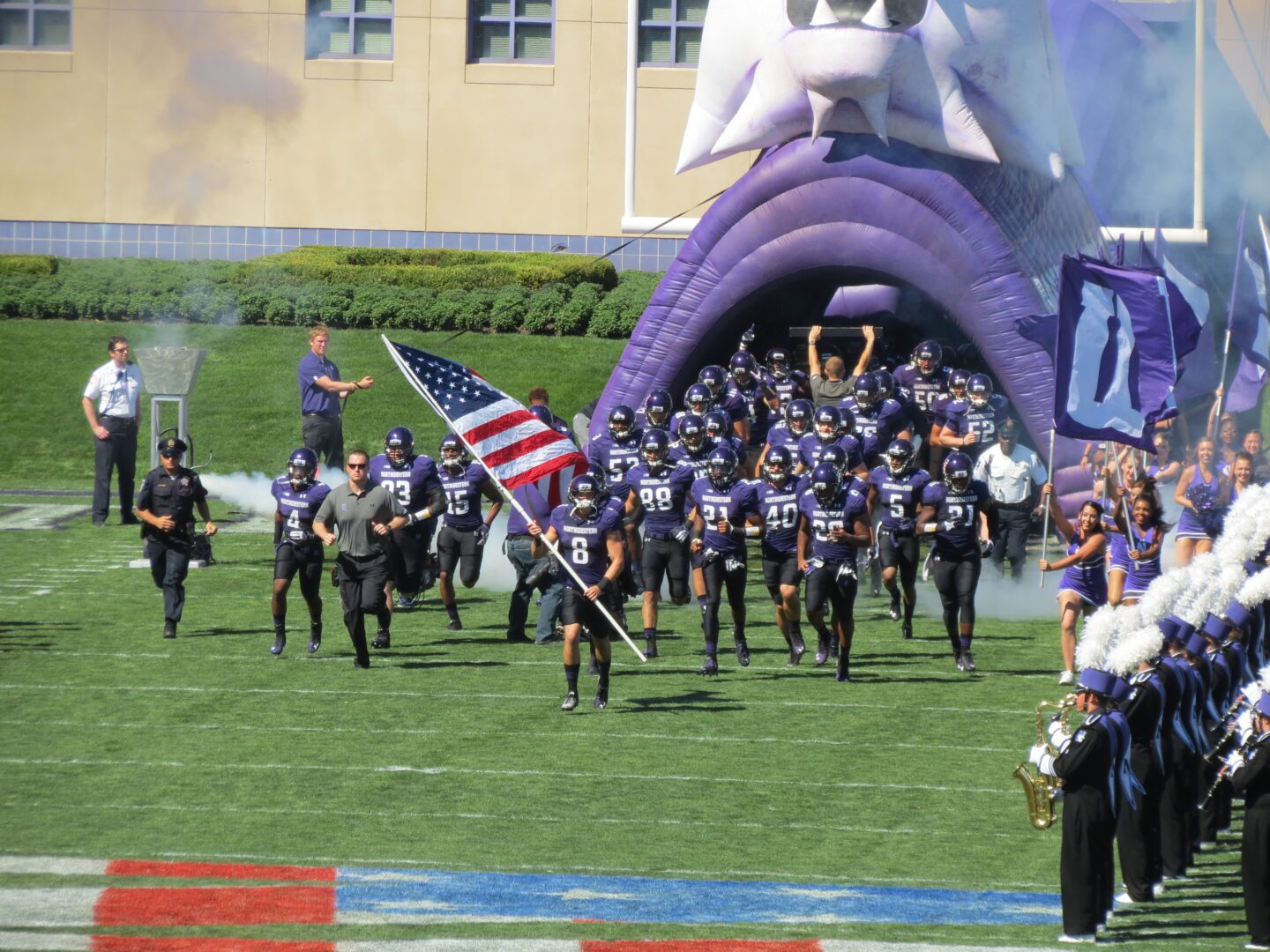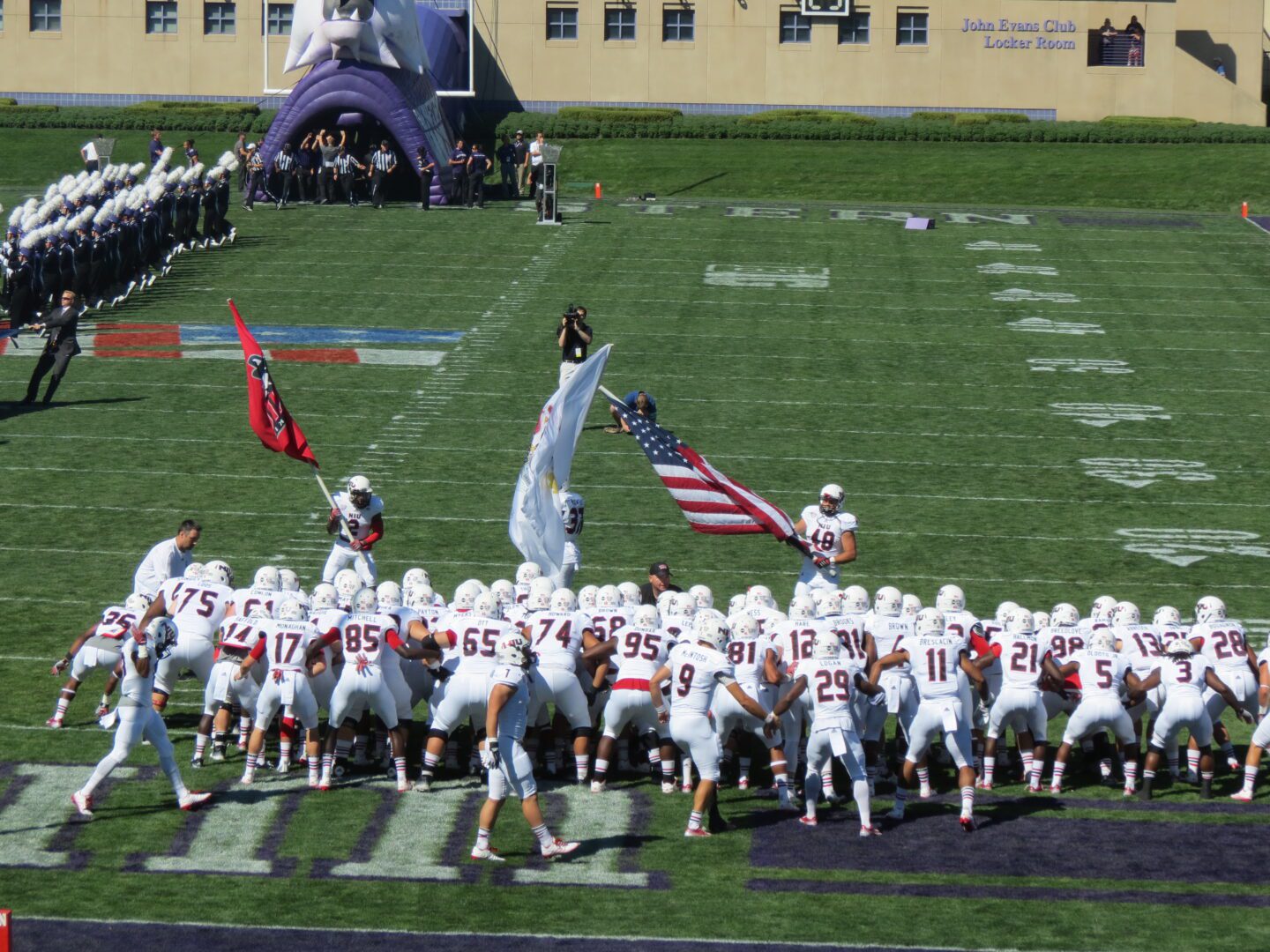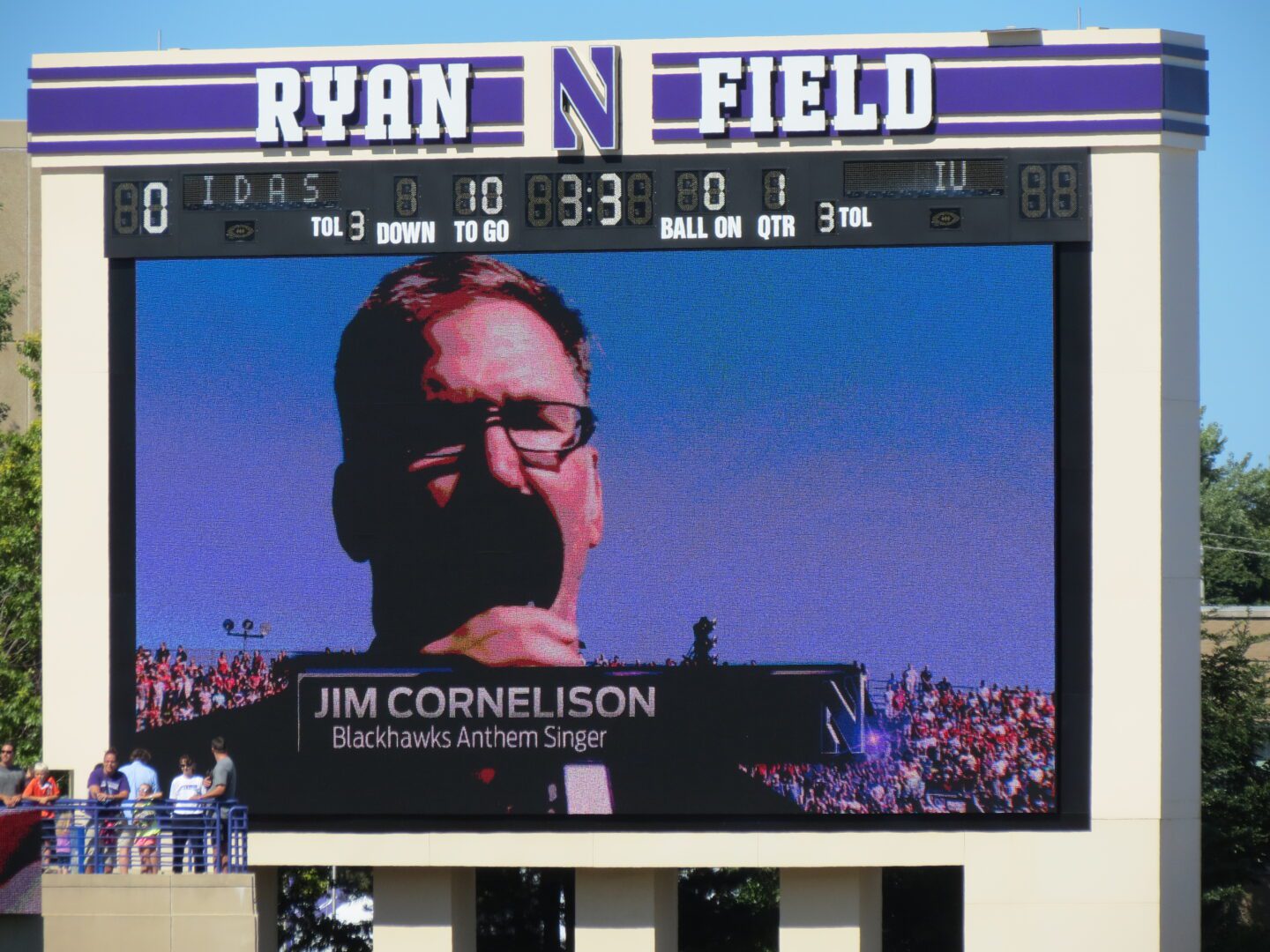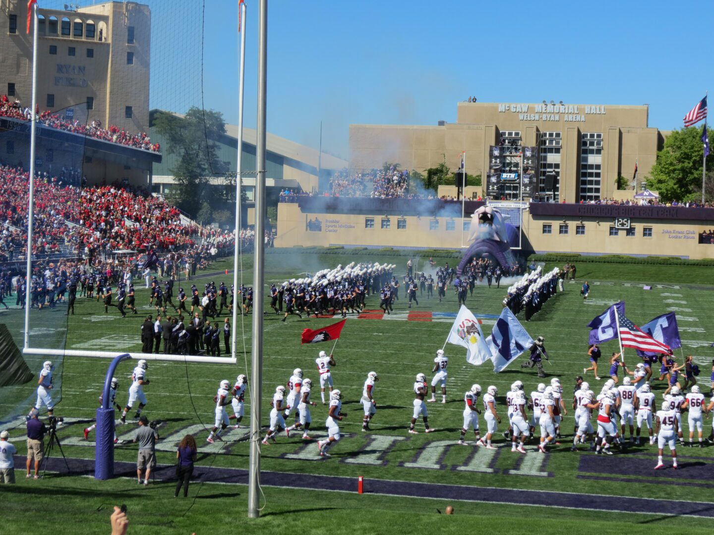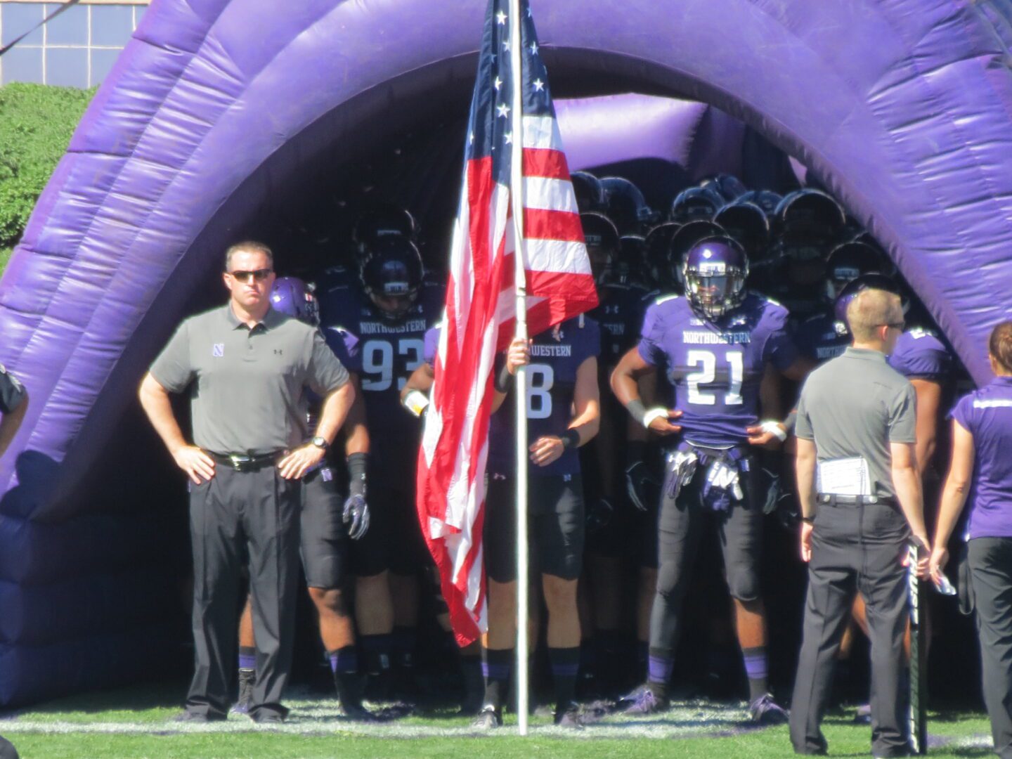 These intrastate foes separated by a mere 75 miles provided a bowl game atmosphere with both bands and solid representation from both fan bases.  Jim Cornelison, national anthem hero for the Chicago Blackhawks, provided some local flair with his crowd frenzying rendition of our nation’s song at the onset of this battle.  It was all part of Heroes’ Day at Ryan Field, where tributes to our country and those who serve was on display.  The logo on the field, the helmet, and the souvenir hats that our group received were all decked in an American flag theme.  Unfortunately for Northwestern, the team itself was unable to keep up with the hero motif.