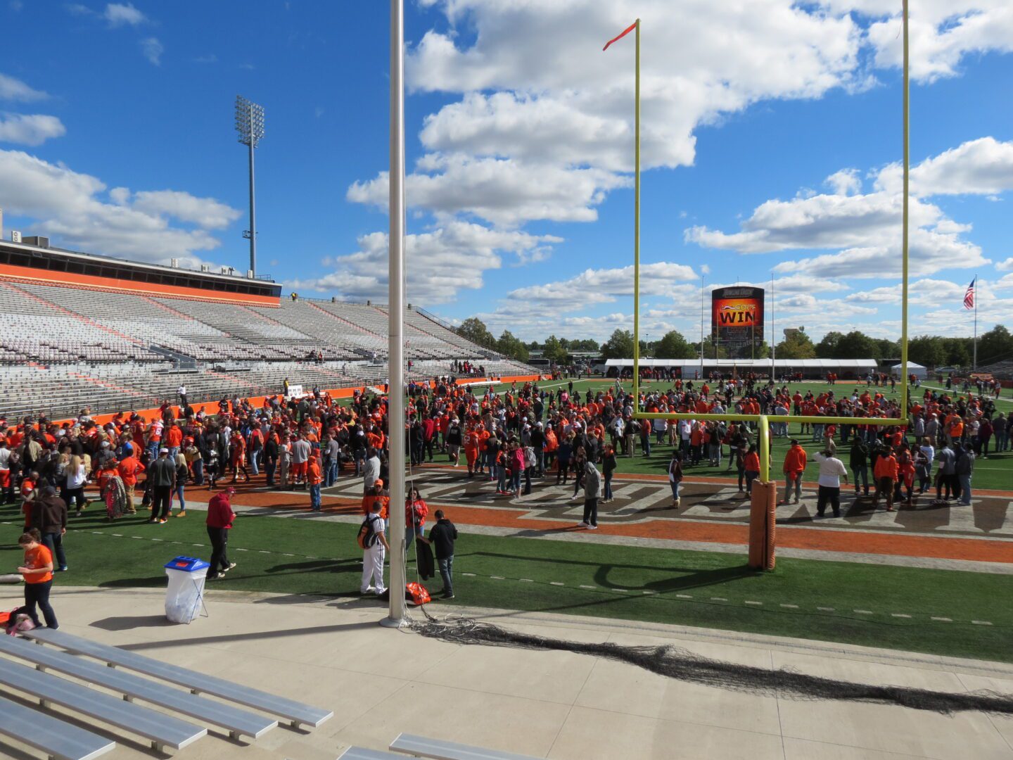 Stadiums like this still harbor an old world quality that many major college football locales have been forced to abandon.  Fan proximity, for example, is not a daunting venture, as The Doyt comes equipped with an end zone fence that allows fans to get up close to the action.   At the conclusion of the game, the announcer comes over the PA and actually invites fans to join the team on the field for post game festivities. This could never be done at places like Michigan, Ohio State, Alabama, etc. Fans would be tearing up the turf, beating up opposing players and fans, and stealing equipment to use as décor in their basements.