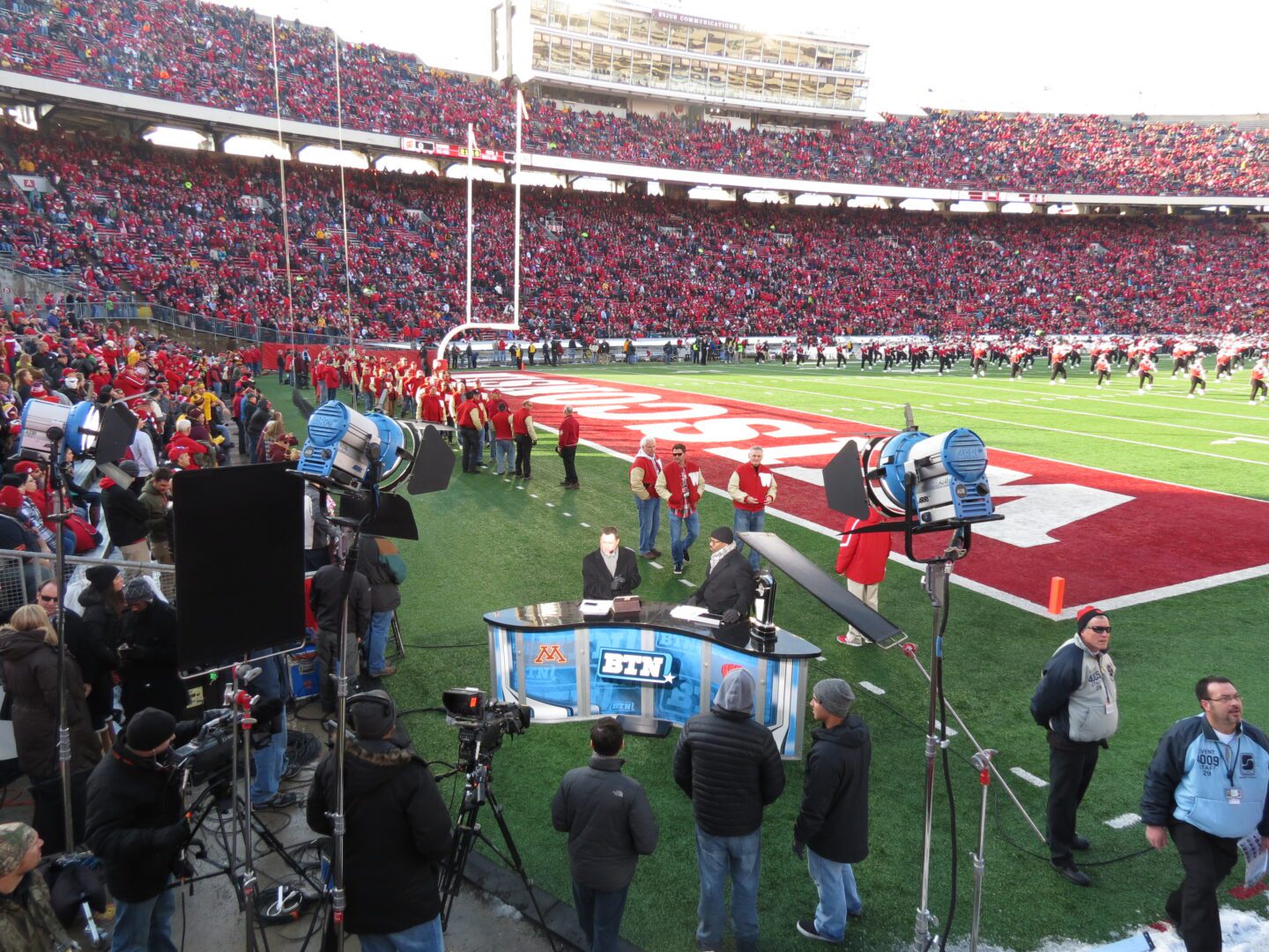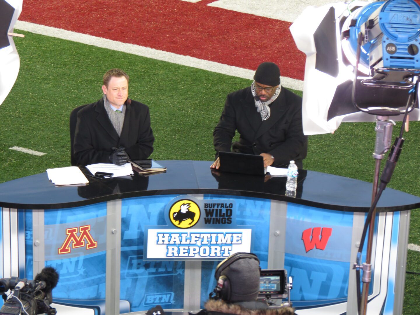 A strong contingent of maroon and gold in the stands would try to help their Gophers end that embarrassing streak. The Big Ten Network, proud to be covering the West Division title, set their anchor booth on the field for all access coverage. Dave Revsine, lead broadcaster for the network and author of the newly released book, The Opening Kickoff, gave me a wave of appreciation after I shouted my praise for his latest release. The broadcast desk was set up right in front of our seats, giving me the opportunity for the interaction.