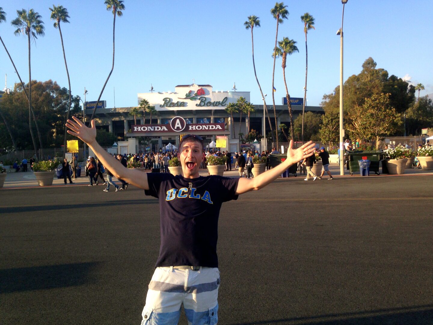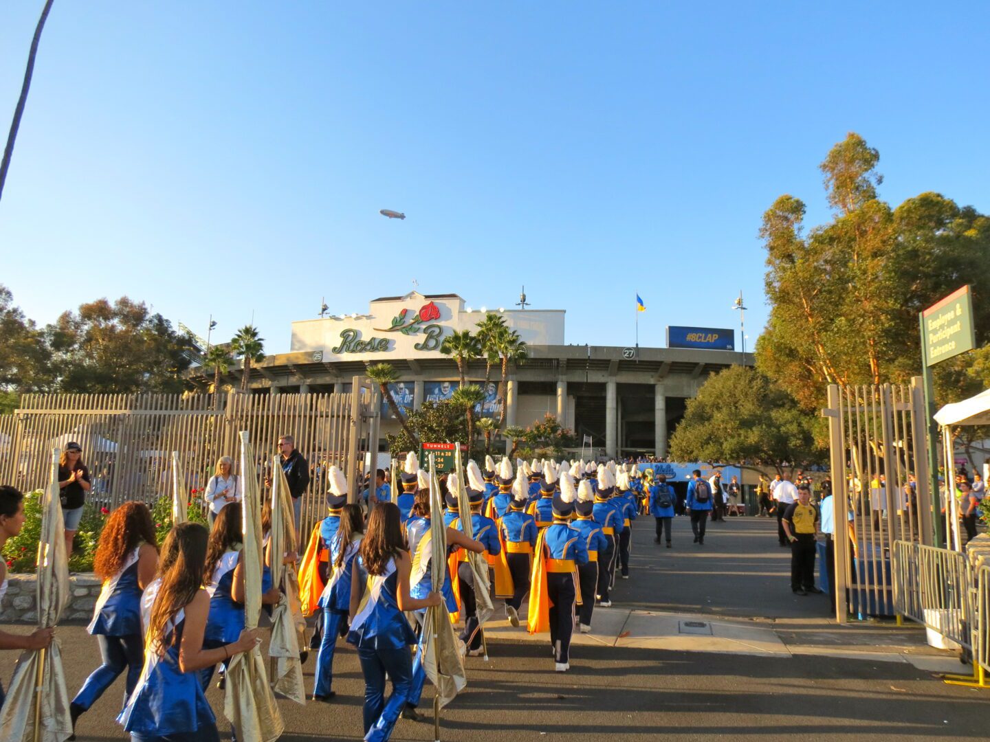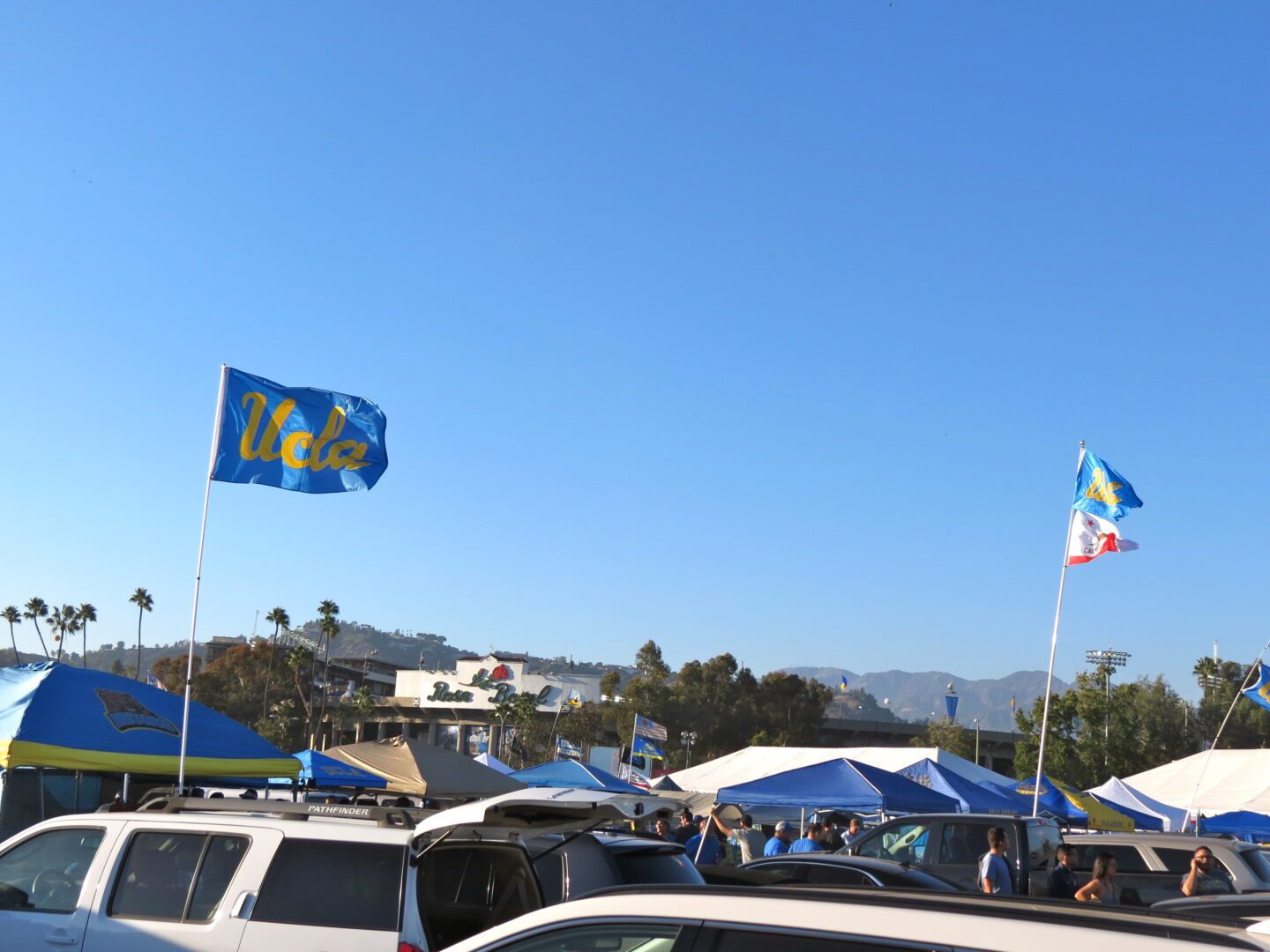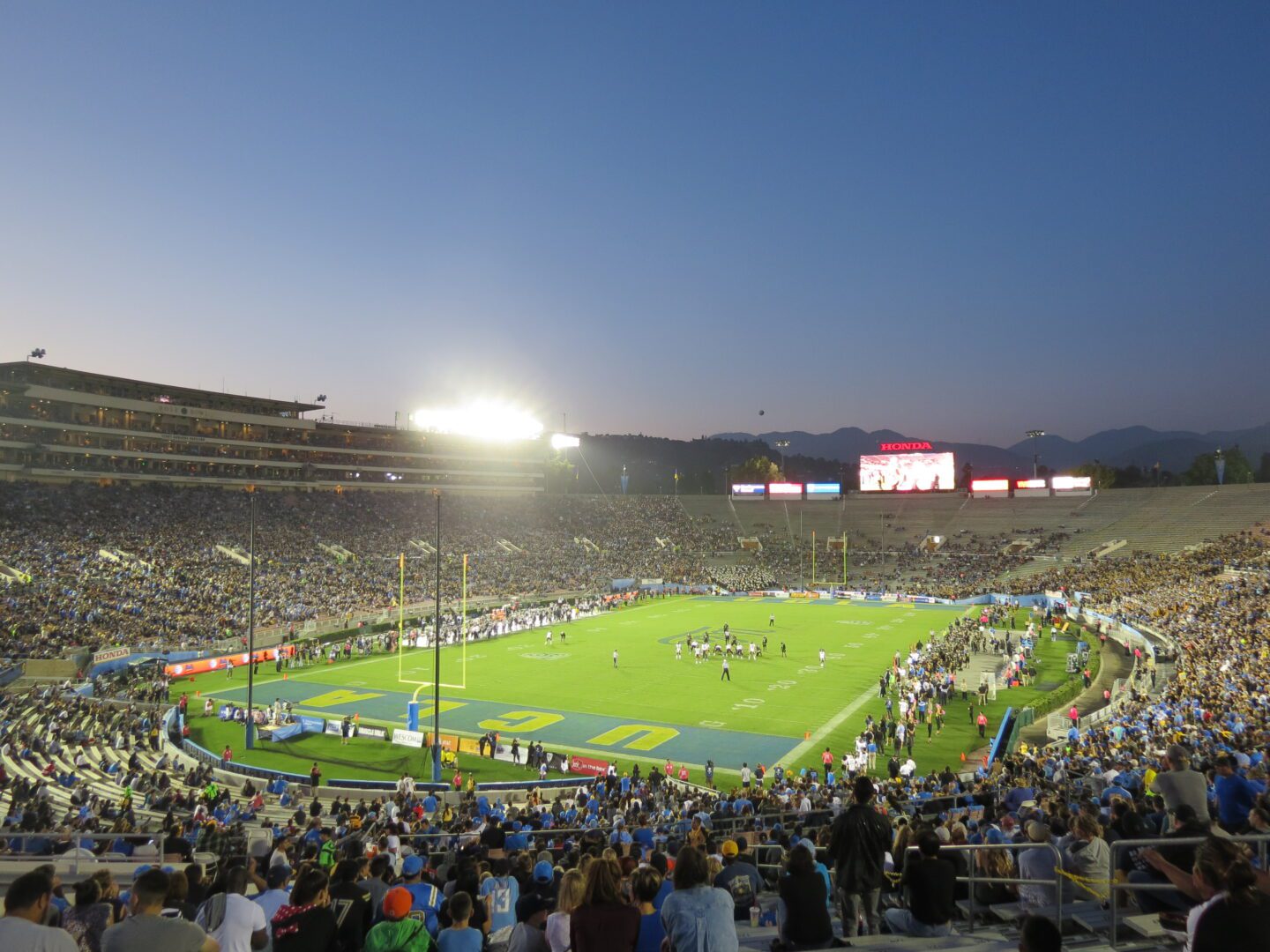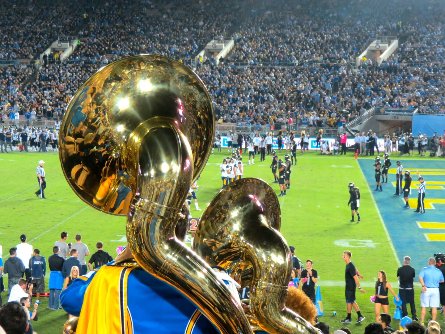 Thursday nights can be a tough draw. UCLA’s classic powder blue and gold uniforms were traded out for a slick black look – a bit of a gimmick to draw attention to a non-Saturday game. It took a little while for the crowd to arrive, but approximately 60,000 filled the Rose Bowl to cheer on their stumbling team. The parking lots surrounding this historic venue filled with tailgaters anxiously awaiting a positive response from their Bruins. The UCLA marching band marched in, proudly playing “Mighty Bruins” and fans followed in to get set for kickoff.