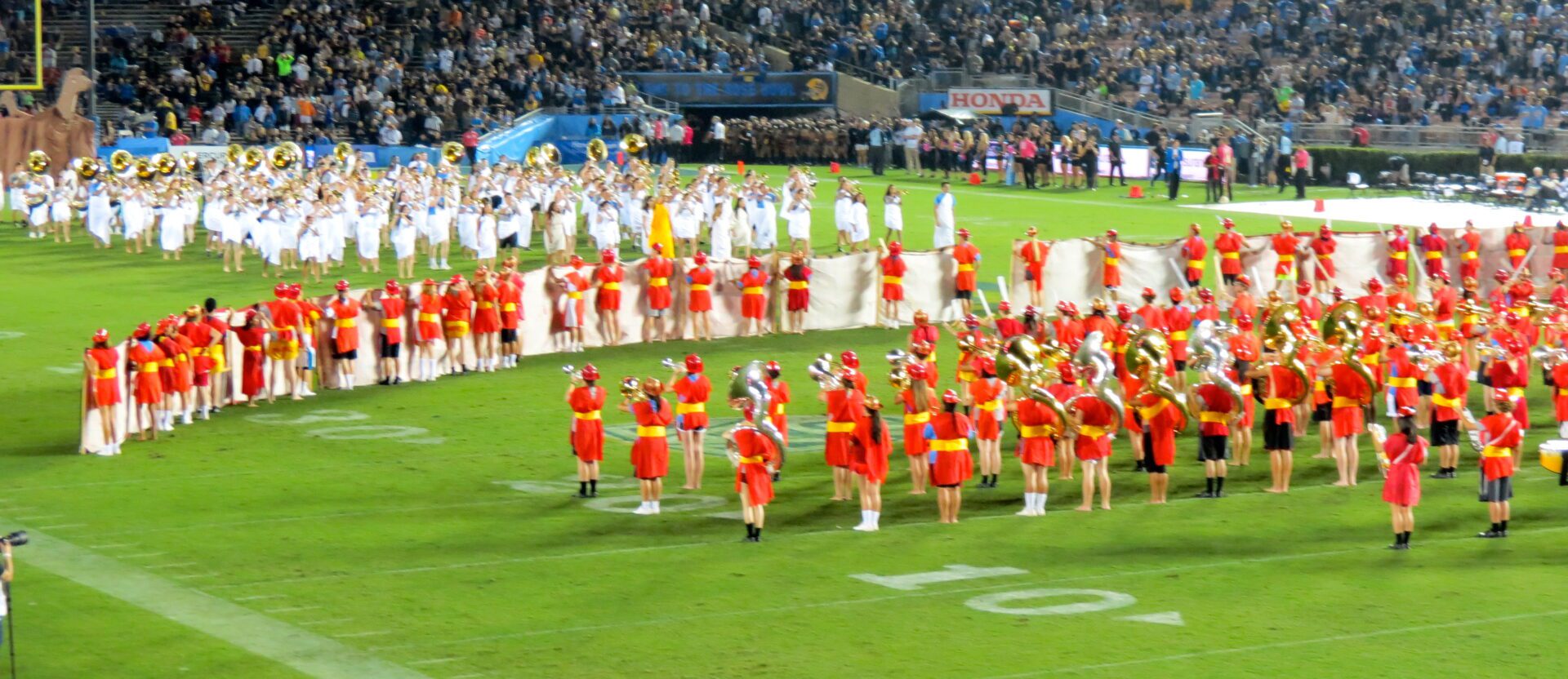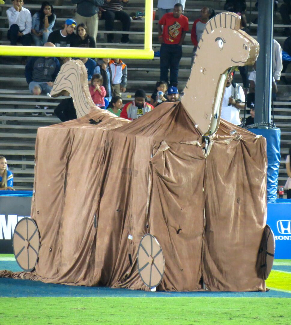 Cal brought their band and a substantial throng of fans from Berkeley. Perhaps the Cal band didn’t get to play the fight song as often as they may have liked, but the halftime performance showcased both bands in a most-memorable history lesson. UCLA and Cal joined forces to reenact the Trojan War complete with costumes, choreography, and a giant Trojan Horse. Fans who typically bolt for restrooms and concessions stayed put to witness this incredible spectacle.