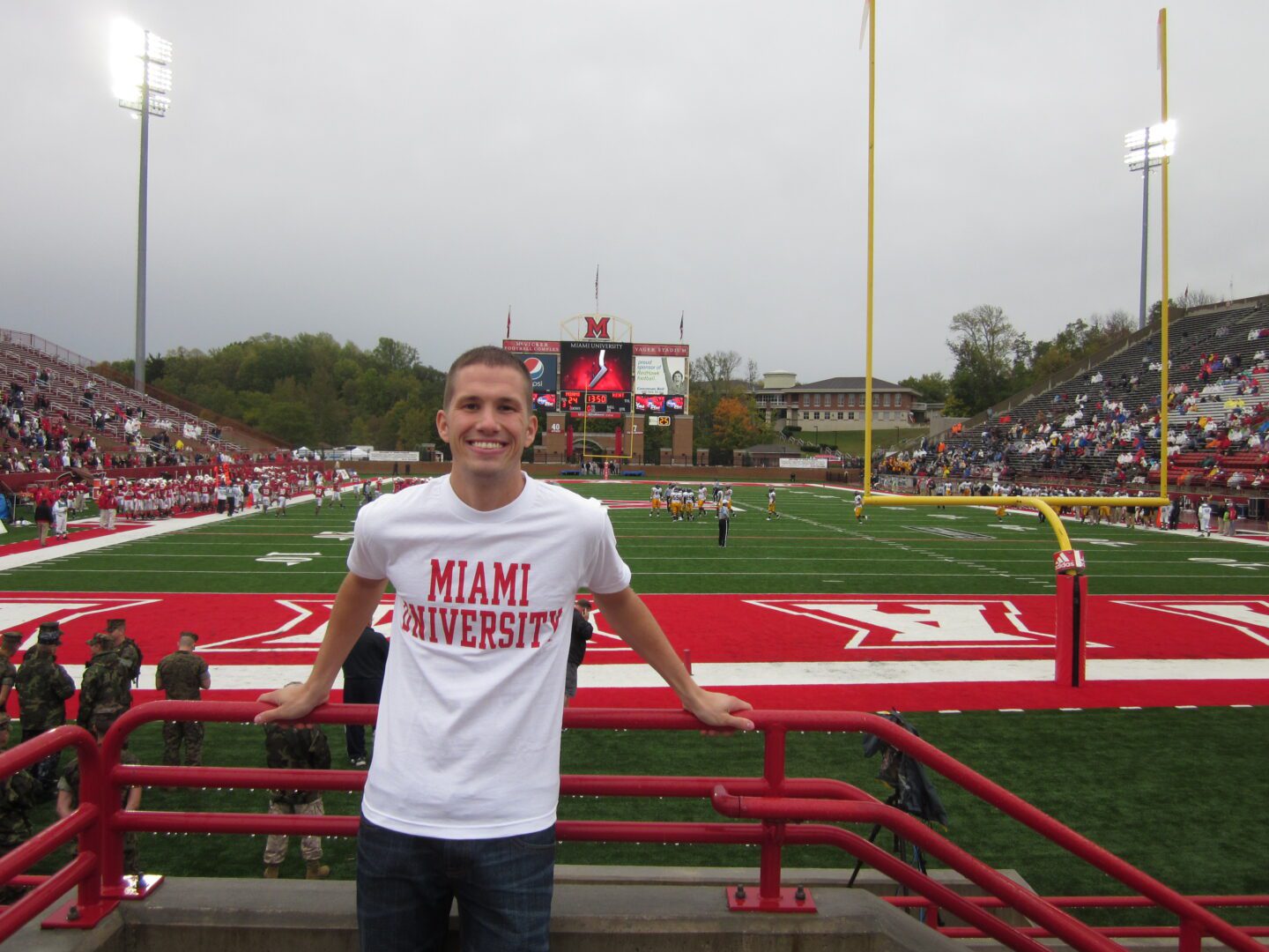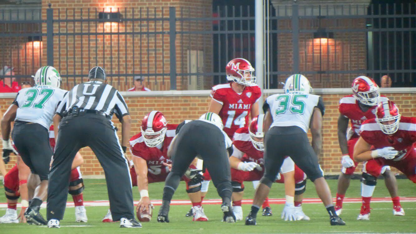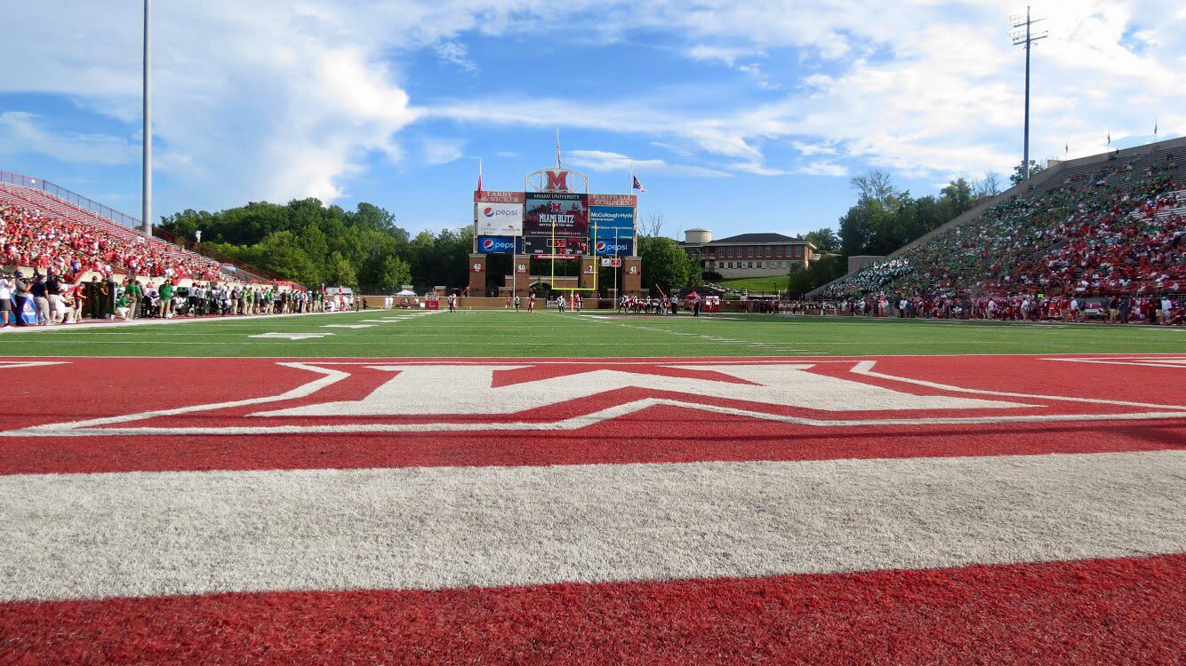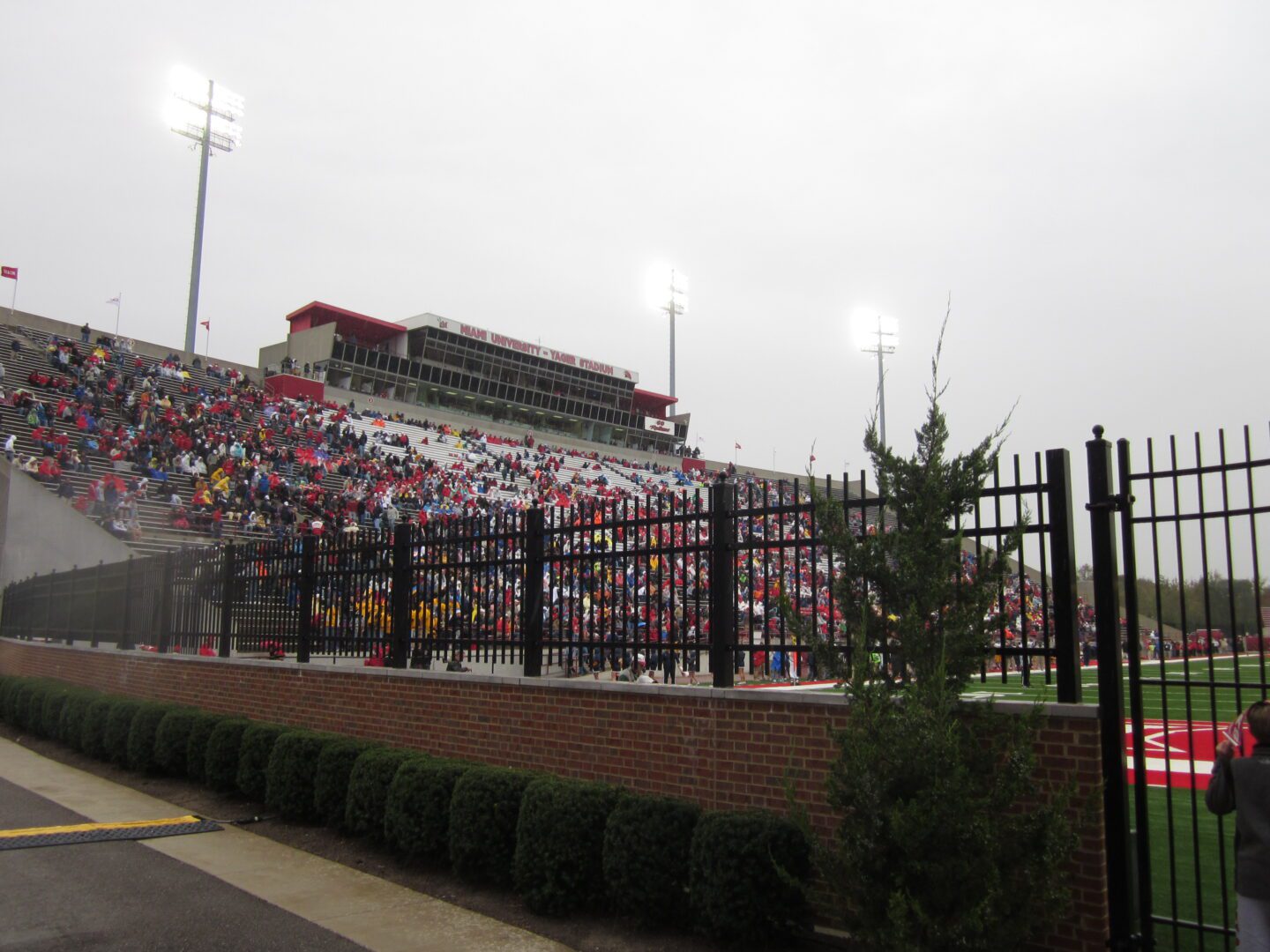 A limited amount of signs provide hope that Oxford is approaching. However, after meandering through a labyrinth of scenery fit for Robin Hood, signs indicating an afternoon of pigskin begin to appear.  Hope turns into wonder as a slight opening in the trees appears to the left ahead. Sure enough, it opens suddenly to Miami’s sports complex with Yager Stadium sitting at the center of attention and Oxford’s beautiful campus with brick lined streets and charming buildings.