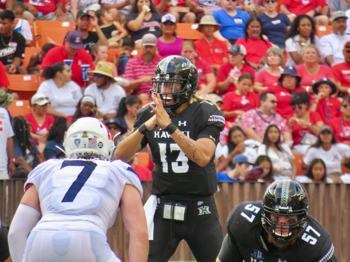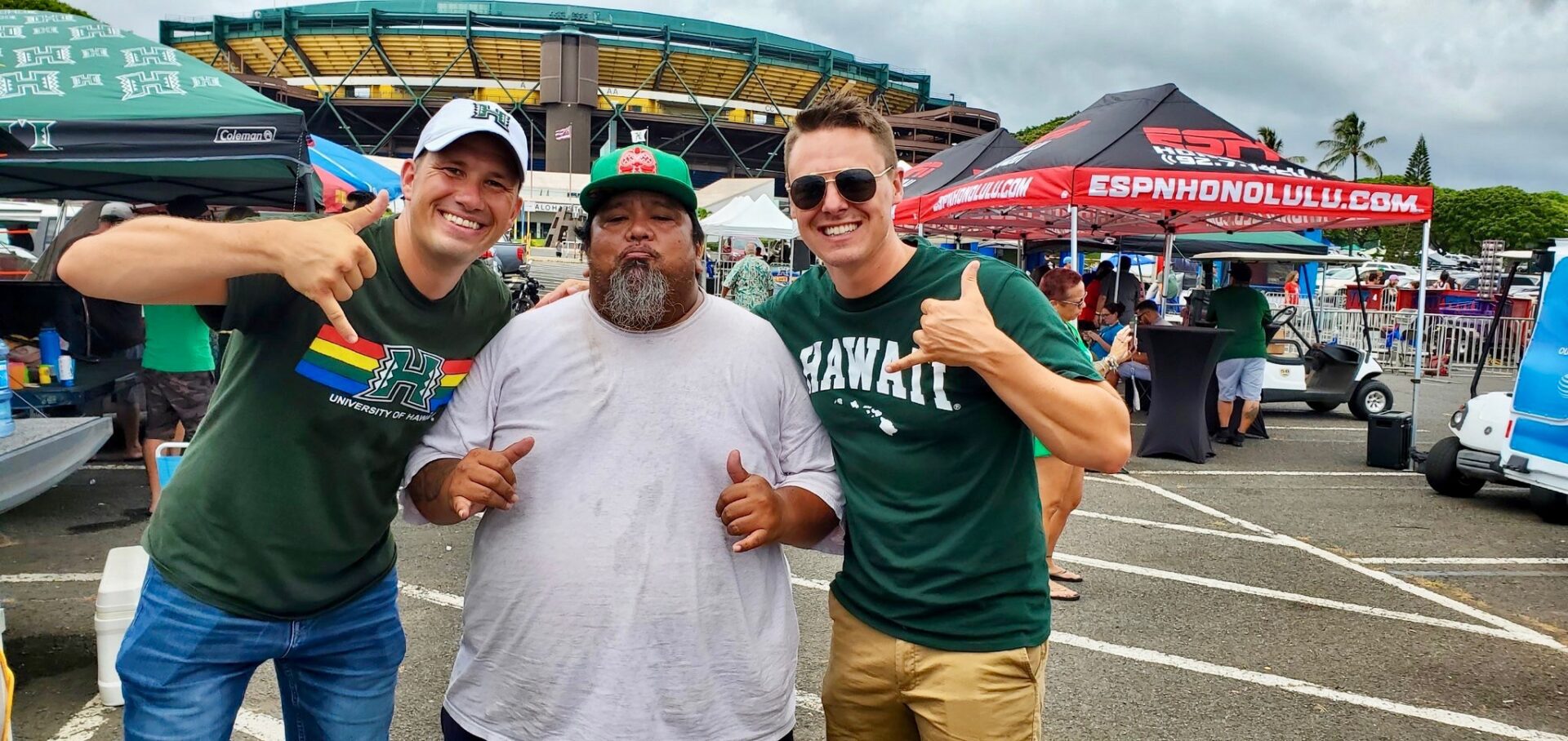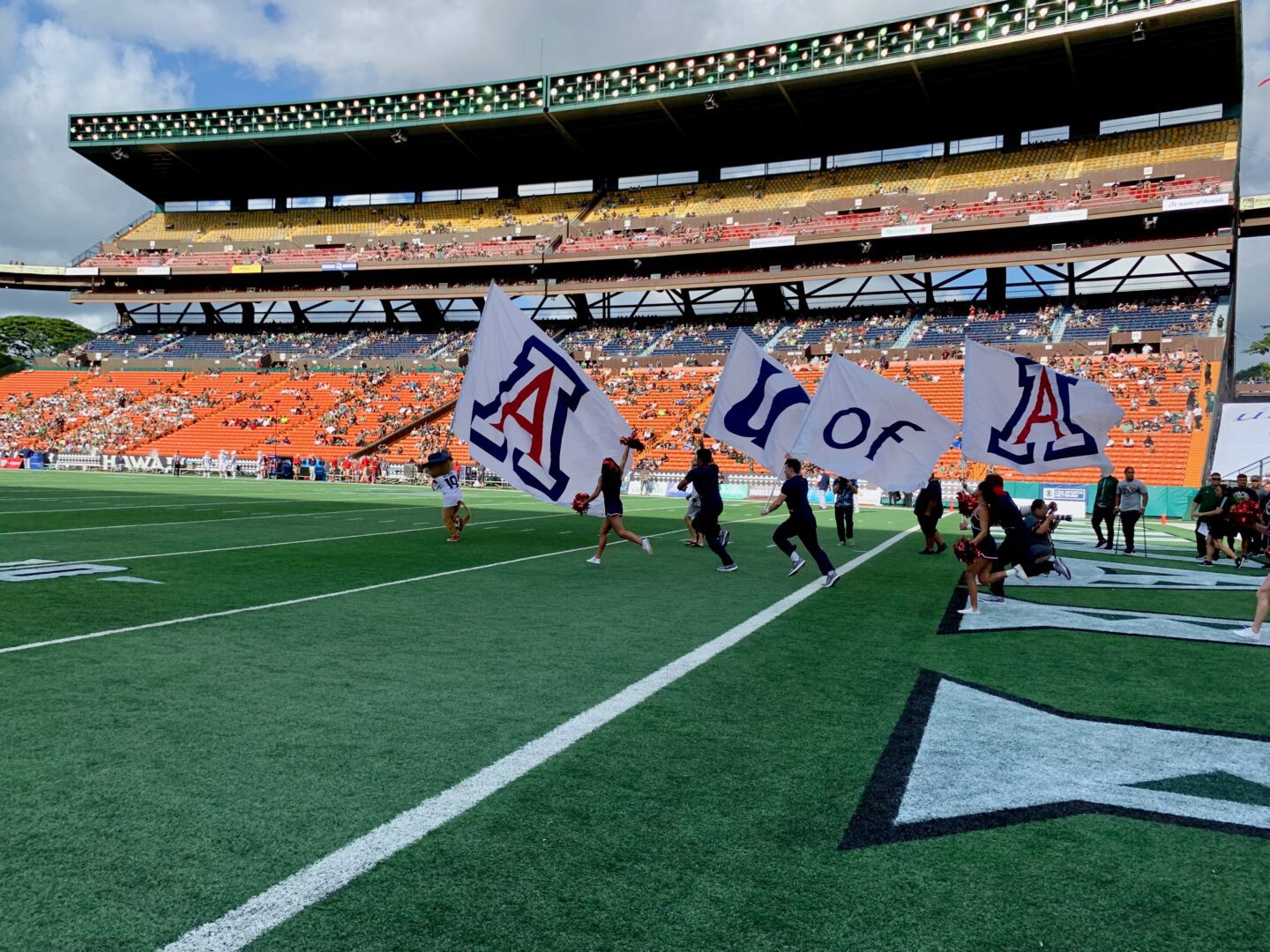 Fans gathered outside Aloha Stadium tailgating and taking in the beats of the Hawaii Marching Band’s drumline. Green and white flags and tents colored the parking lot as talk loomed of a hopeful upset over the Pac Twelve’s Arizona Wildcats. I had the pleasure of sharing pregame with some of the greatest college football fans the sport has to offer proving that it doesn’t matter where the sport is played, college football fan bases are undeniably special. Opening season anticipation saturated the scene and all to the tune of perfect island weather.