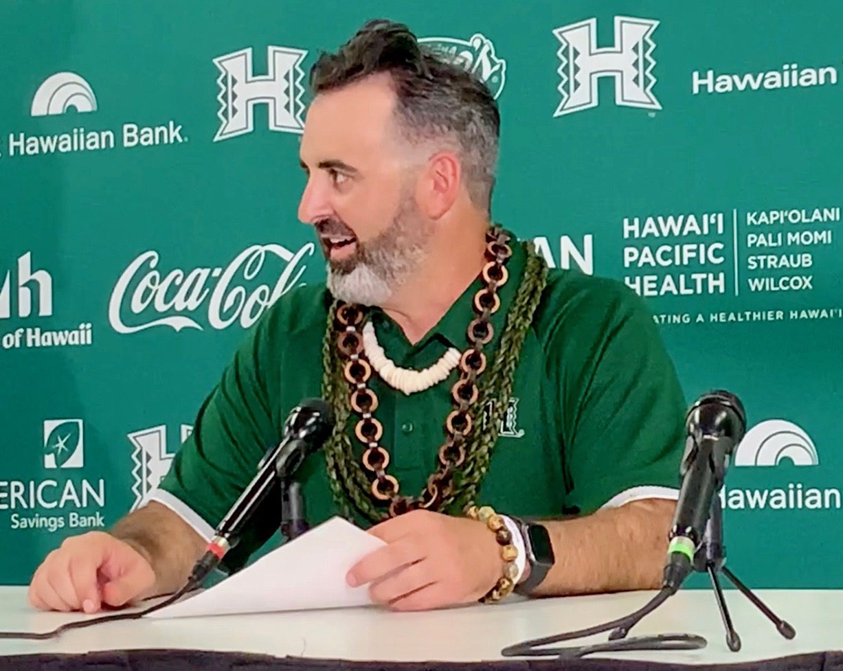 The best game of the day went deep into the night for mainlanders. The only dejected player wearing green was QB Cole McDonald, who was pulled after 4 interceptions despite his 4 touchdowns. QB Chevan Cordeiro took over and during postgame explained that he was ready for the moment. WR Cedric Byrd had 4 TDs of his own. Head Coach Rolovich connected it back to a Tomey mantra when he praised his defense in critical moments: “The ball. The ball. The ball.” The sun set over the islands as the sun rose on Hawai’I’s season with a thrilling opening victory.