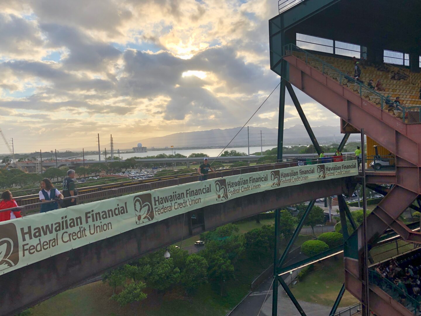 Along with Aloha, the thumb and pinky extended is another key symbol of the islands. Known as the “shaka,” it’s often associated with “hang loose” and a surfer lifestyle. It embodies the laidback nature of the islands. But, in Aloha Stadium, it is also a cheer symbol that unifies and connects the fanbase. Throw up a “shaka” for “hello” or “awesome” or “yay”!