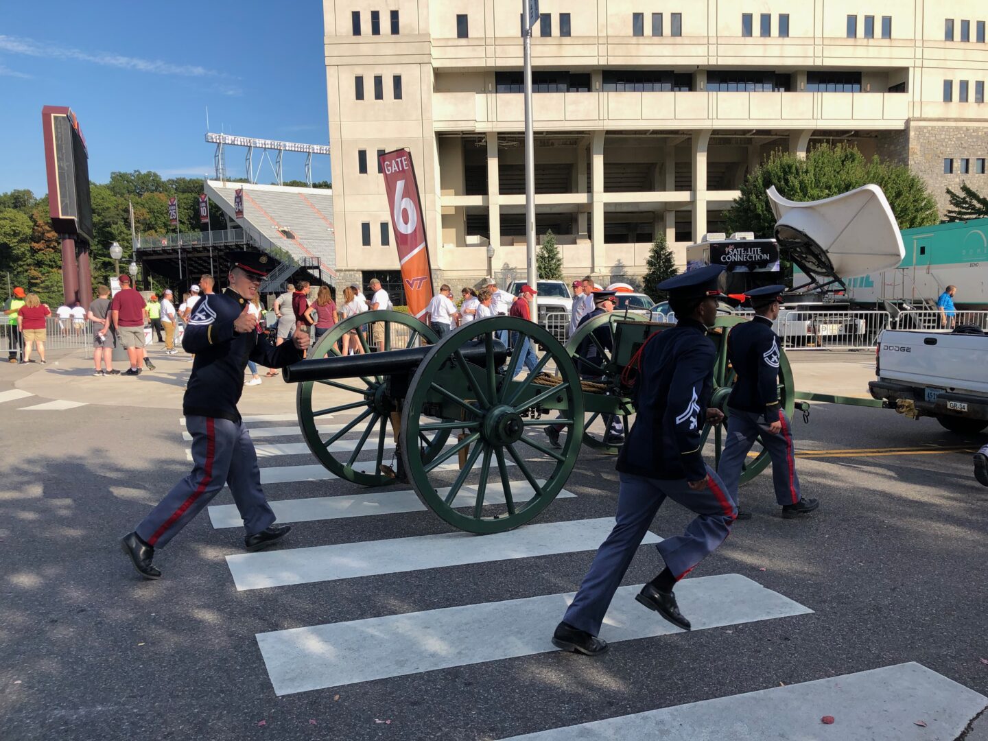 Pregame fanfare begins with the Hokie Walk. Virginia Tech enthusiasts line up ready to welcome their Hokies into Lane Stadium. Led by the Virginia Tech Regimental Band (The Highty Tighties), the cheerleading squad, and the Hokie Bird, everyone gets an opportunity to witness the gameday atmosphere up close. The entire experience elevates the anticipation meter.