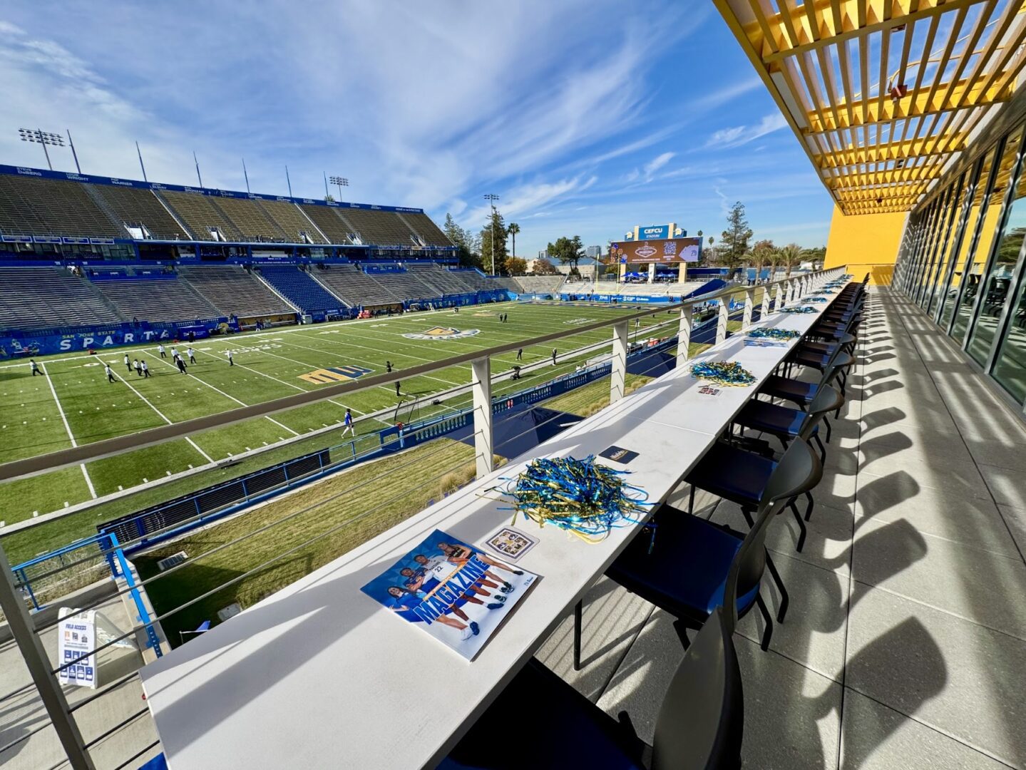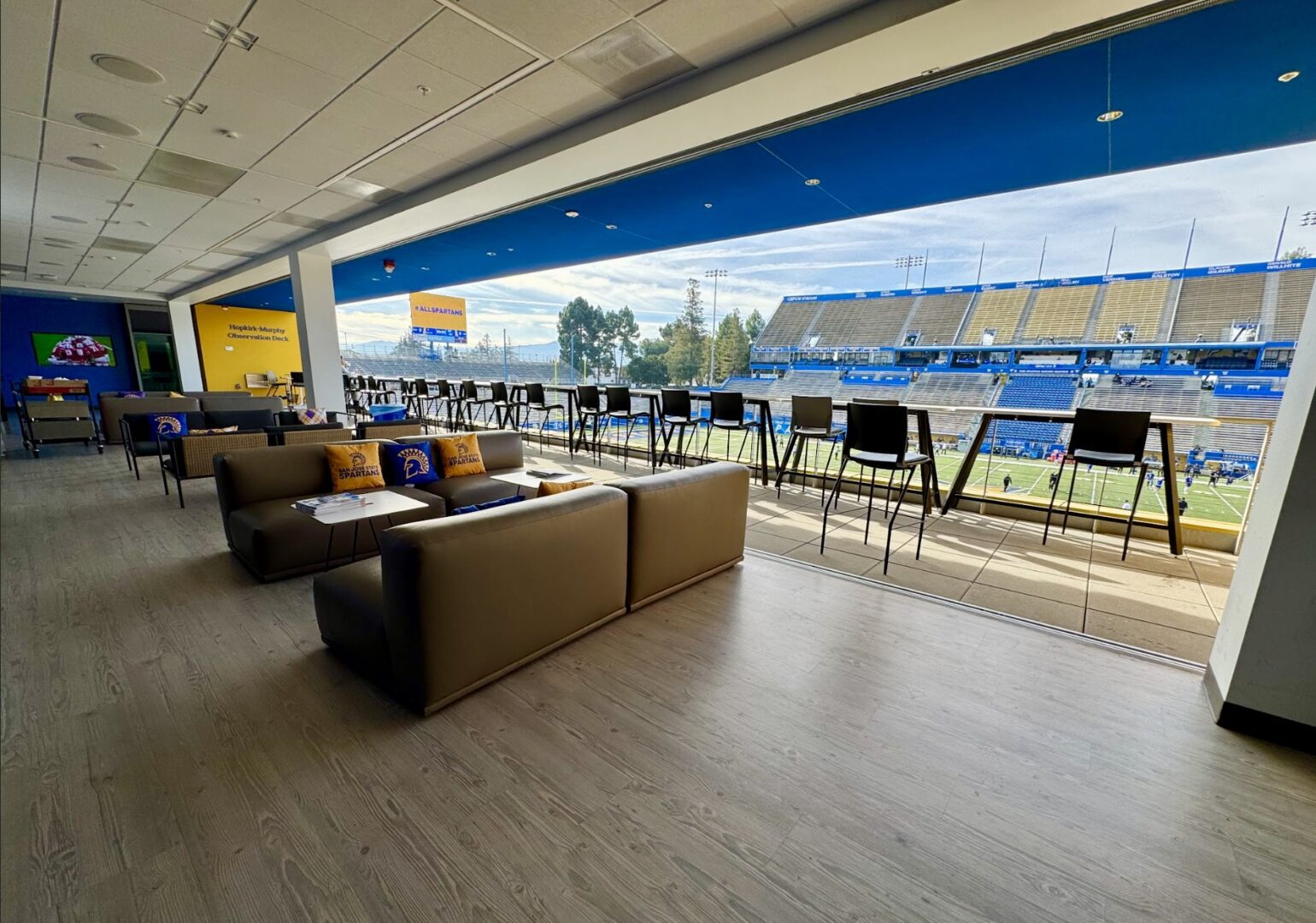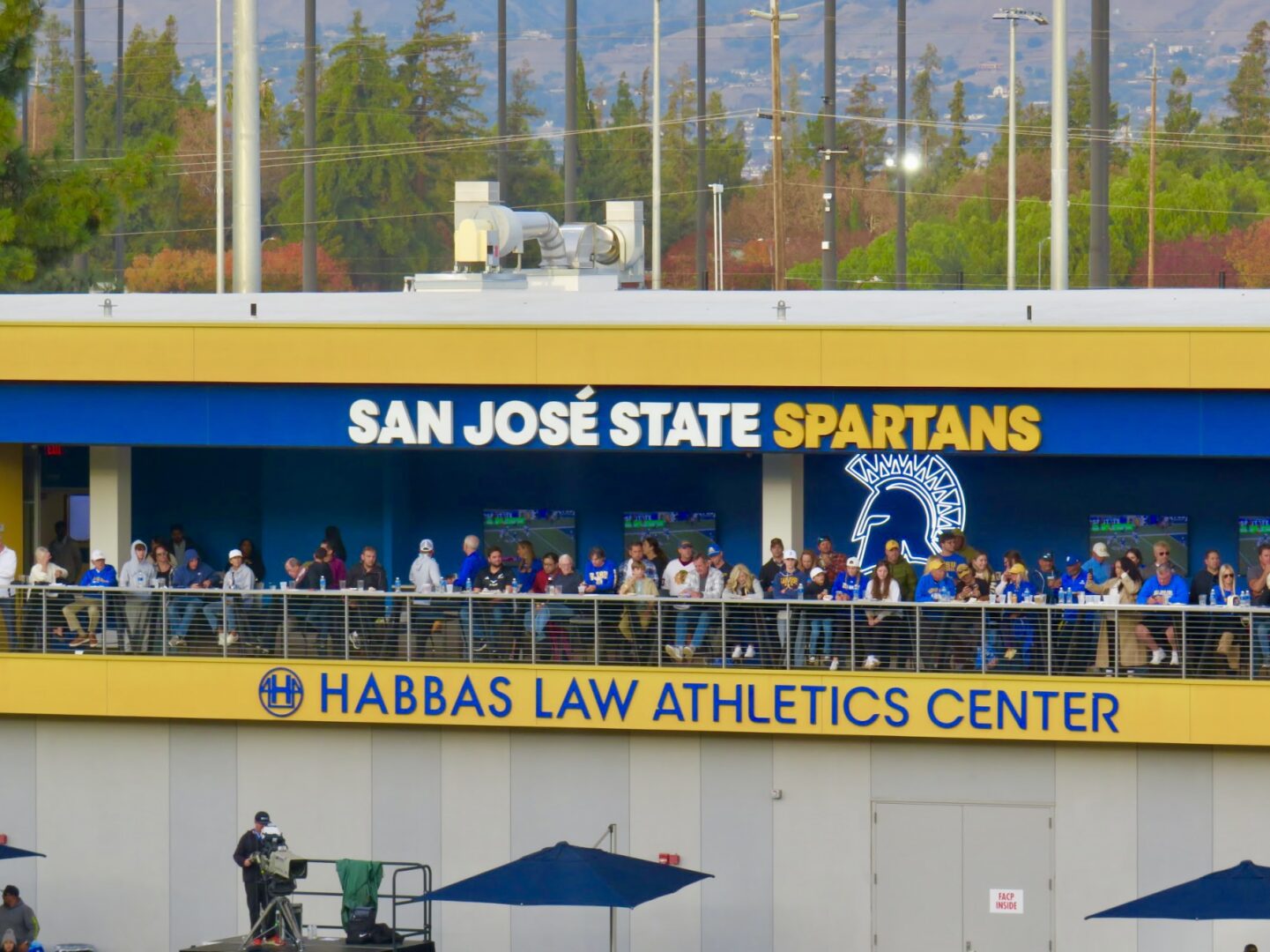 The integrity of the facility has been maintained, but the entire sideline opposite the press box showcases an athletic complex that features club seating along the second level. While it houses locker rooms, meeting rooms, and much more for Spartan athletic programs, it also provides fans with creative seating options featuring fantastic vantage points. At ground level in front of the complex, a variety of umbrella covered tables and chairs span the sidelines for additional viewing.