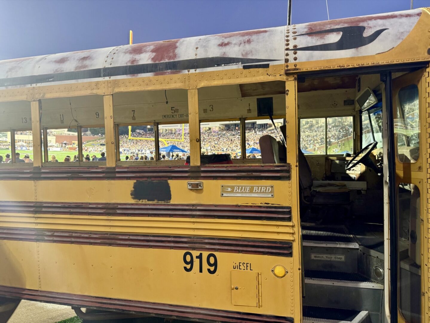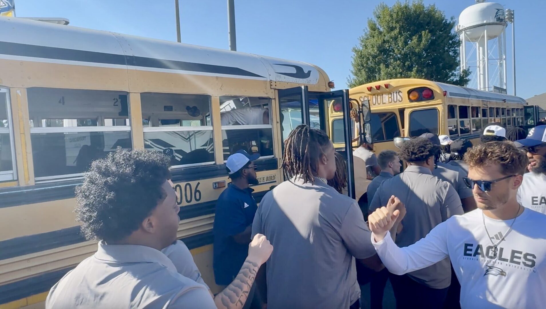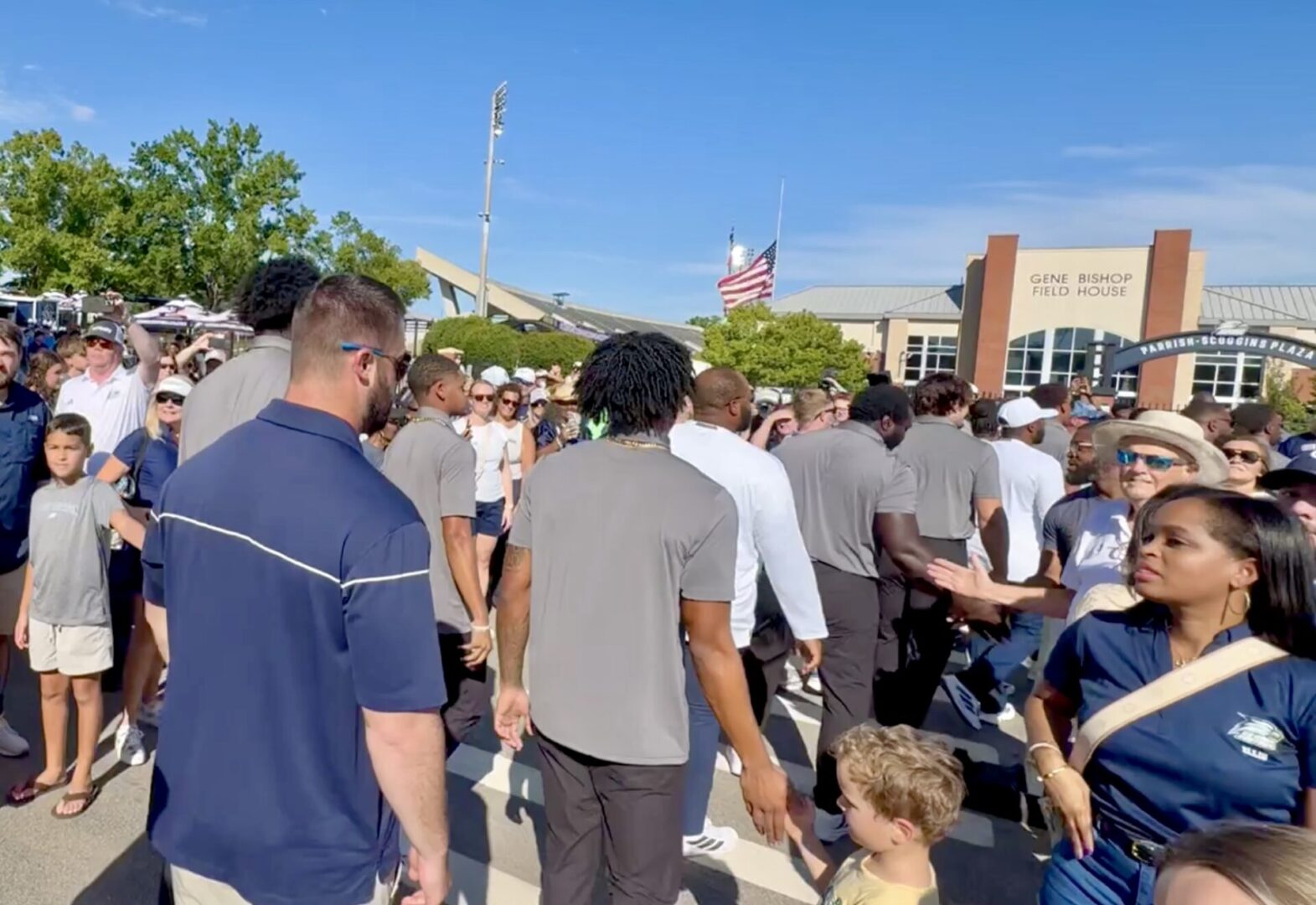 Gameday begins with a tradition that cements the essence of Georgia Southern. Known for its blue collar mentality, the football team is transported through town to the stadium by yellow school buses. The journey represents Georgia Southern’s modest early days when the football facilities were not on campus and simple yellow buses were the primary form of transport. Football was dropped in 1941 and didn’t return until the early 1980s when a hard-earned turnaround resulted in championships achieved. As the program in Statesboro has grown consistently prosperous, the yellow bus tradition remains a reminder of the determination that gave the Eagles their wings. The fans enhance the spectacle as they gather on the streets to cheer as the buses wheel through. When players get dropped off near Paulson Stadium for the Eagle Walk, they are greeted with a rowdy and loving reception by the Georgia Southern faithful.
