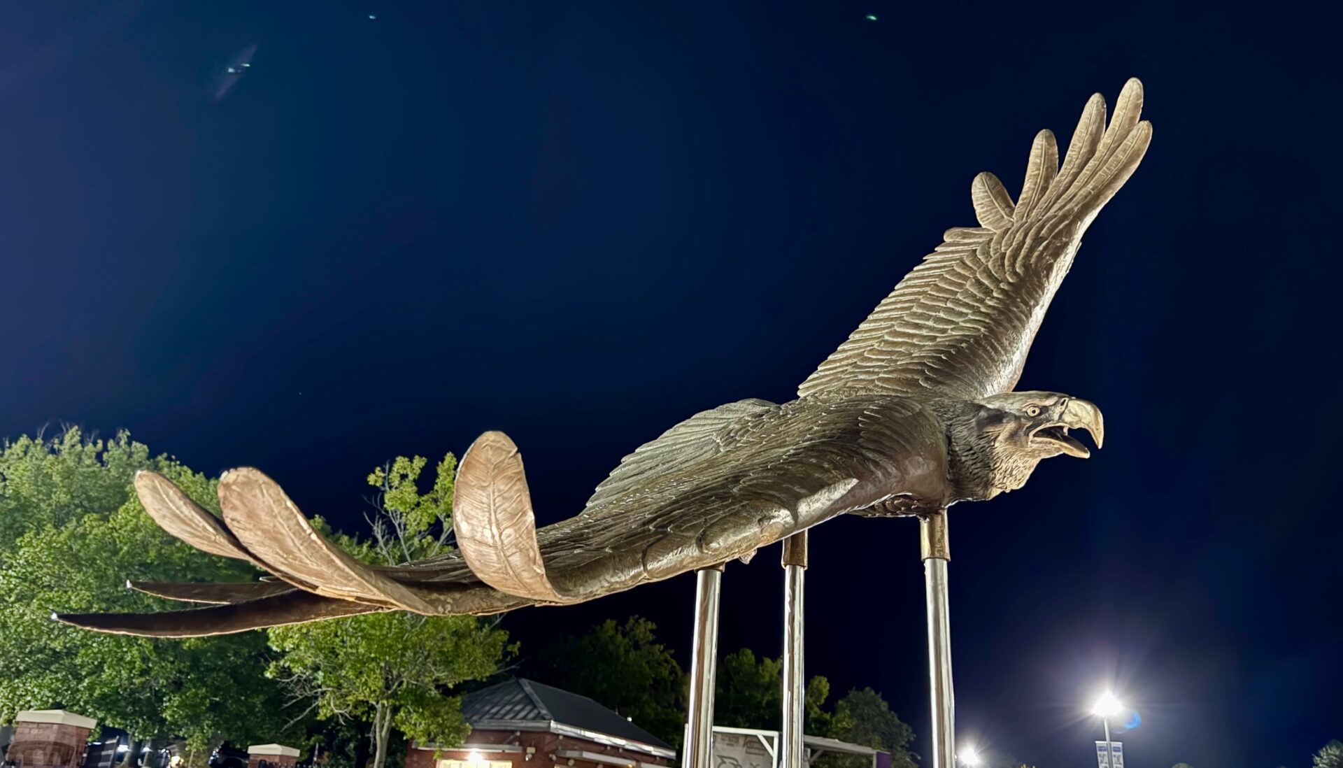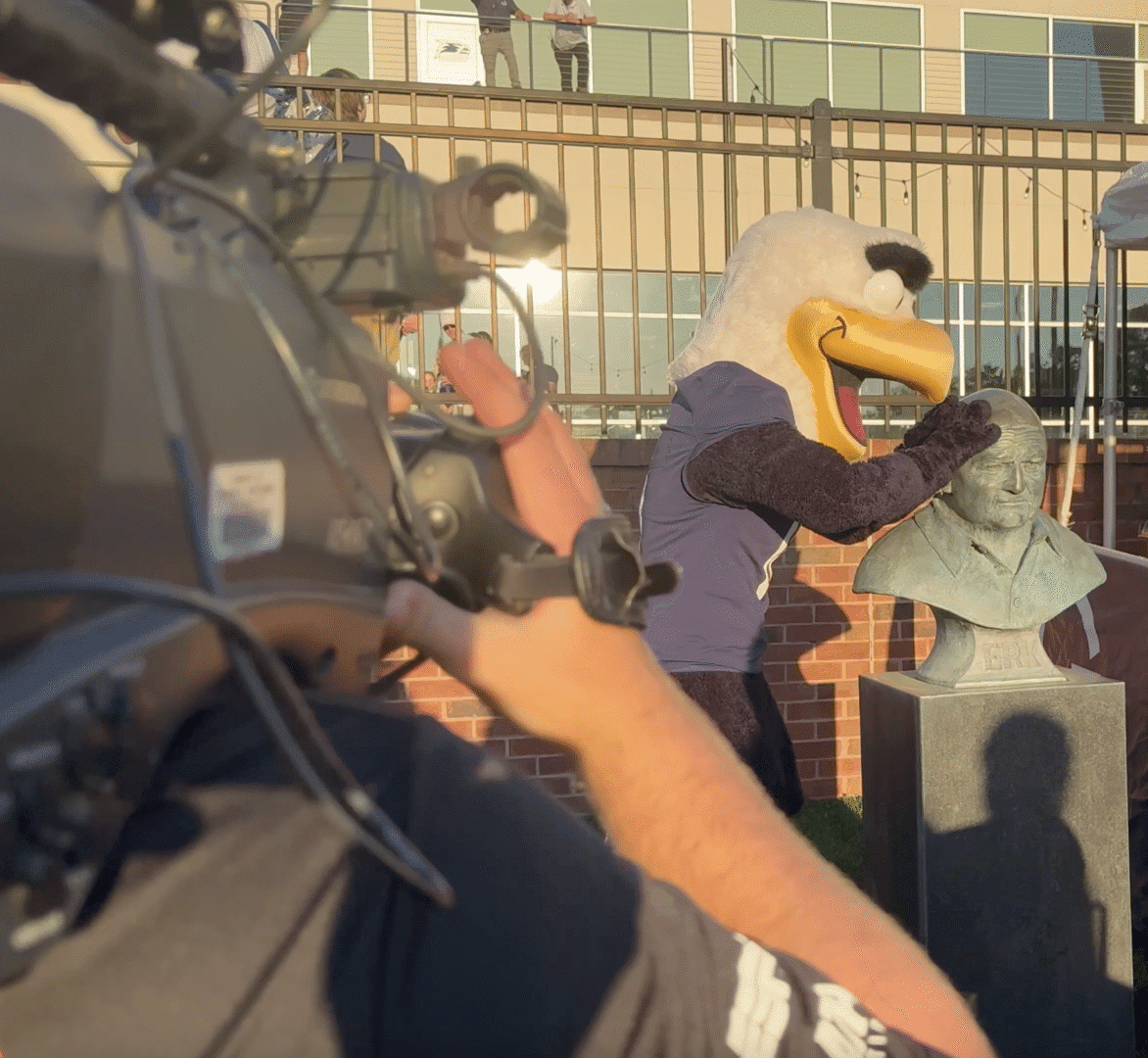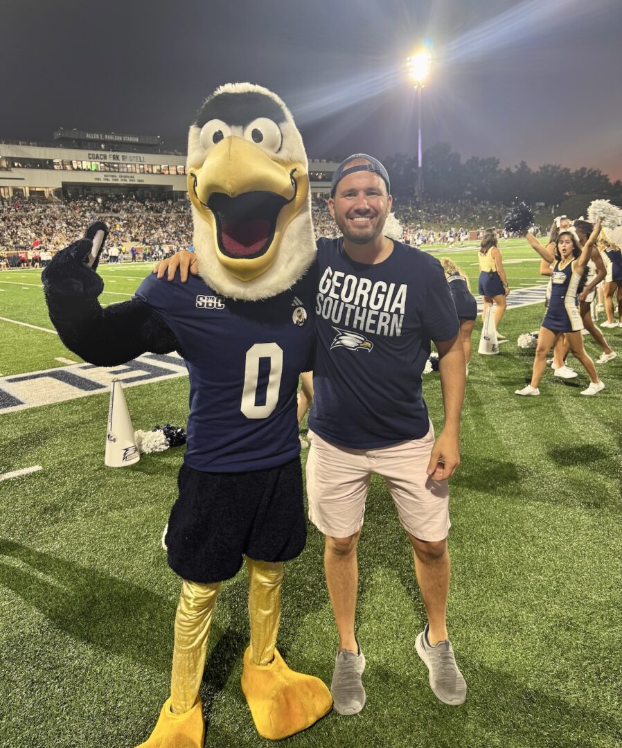 Mascots are emblematic of the spirit of a school, but few mean more than the live eagle that takes flight before kickoff on Georgia Southern gamedays. In 2007, Freedom was introduced and became an instant legend. Flying over the stands, this majestic eagle defined the soul of Georgia Southern. Thousands of proud eyes lifted their gaze toward the soaring strength of Freedom – a single creature above that unified the masses below. In the spring of 2025, Freedom passed away triggering shock and sorrow across the Peach State. Tributes and tears graced the home opener as fans embraced the memory and legacy of Freedom. A bronze statue now rests outside the stadium immortalizing his dynamism and grandeur. As healing runs its course under quiet skies, the future above Paulson holds winged legends that will carry on this treasured tradition.