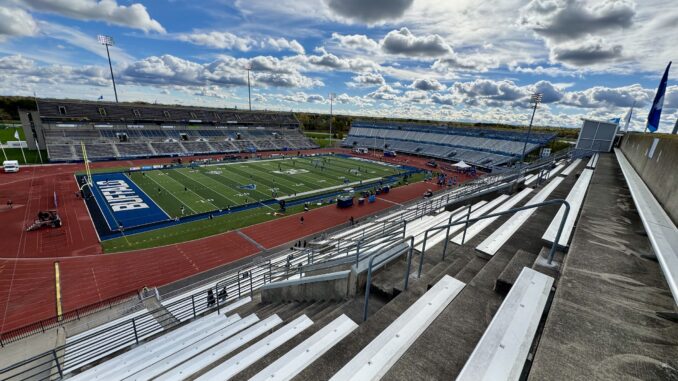 Once inside, UB Stadium proves to be a sizable structure. Fans have to really use their lungs to make their voices heard as the wide running track divides fans from where the football sidelines begin. However, cheer squads close that gap pointing their energy to the crowd to ensure engagement. Victor E. Bull sprints to various corners to bring the hype and delight to onlookers.